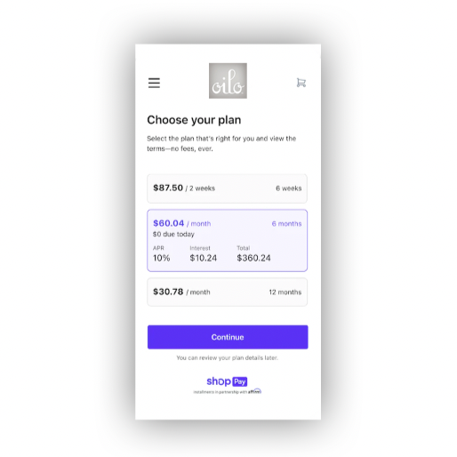 We're excited to let you know that we have teamed with Shop Pay to give you the option to buy now and pay later. There are no late or hidden fees, and you'll never pay more than you agreed to up front. You can check your balance in the Shop app any time.