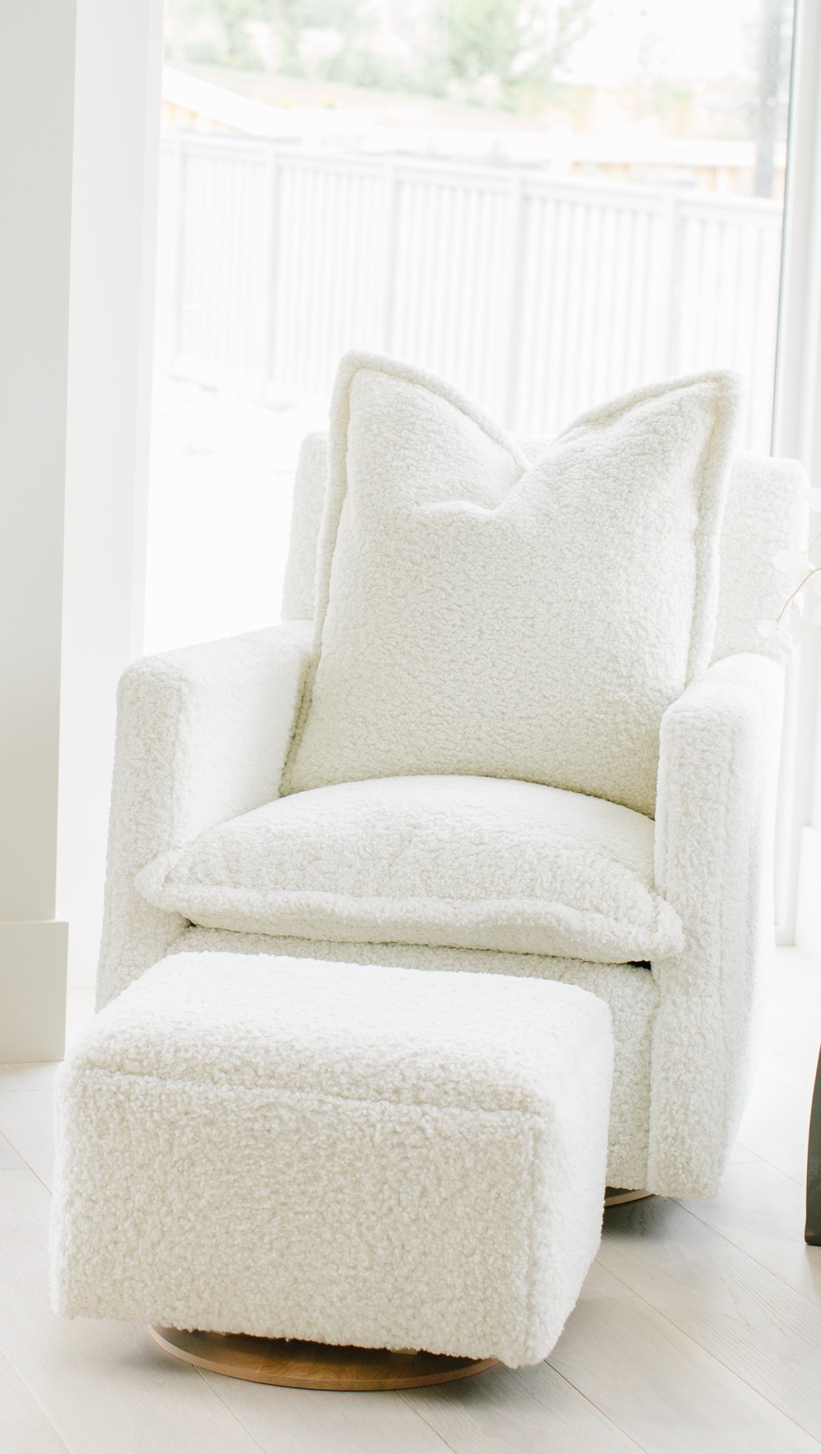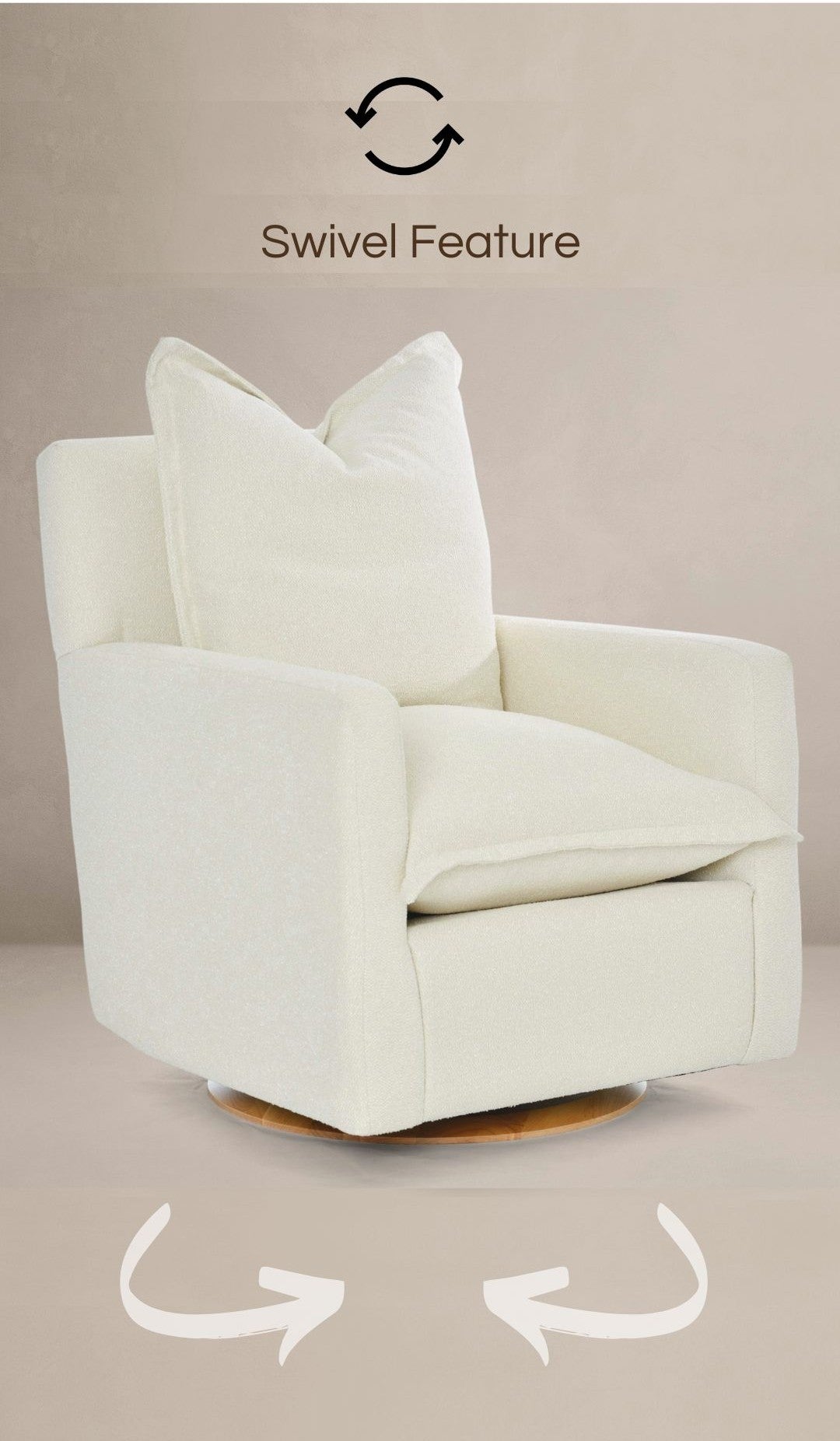 With removable, plush cushions— Our Nola Swivel Nursery Glider has a full 360º swivel motion and parallel rocking motion that gently glides, allowing you to easily turn toward anything you might need to reach. The Nola glider features removable cushions, with cushions made from a luxurious down alternative so you get that sinking-in filling when you sit in your chair. Embrace style, comfort, and sophistication!